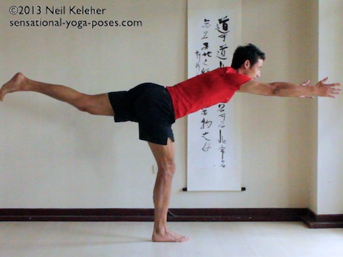 Again, avoid if you have knee pain. If working towards this over the course of several beginners yoga workouts then first work at relaxing the leg you are trying to lift. Make your supporting leg strong. Once you can lift one leg, work at holding for a few seconds. Also work at slowly lifting and lowering the leg.