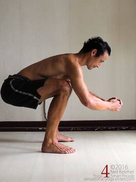 One problem that some people have when doing deep squats (or even doing thighs parallel to the ground squats like chair pose) is staying balanced. Some people tend to tip back as they go lower. How do you stay balanced while doing squats?