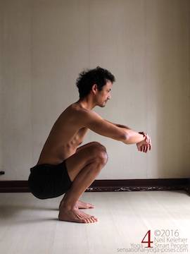 Collapsing the arches by rolling the shins inwards can cause the knees to touch even if the feet are separated. Rolling the shins outwards can cause the knees to separate and that can be handy if you want to learn forwards between your knees. If you have knee pain while squatting this is one action that you can play with to see if it helps alleviate knee pain.