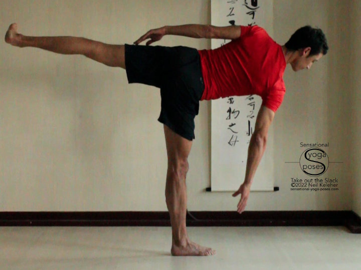 Moving into a standing side bend, you can start with weight even on both feet. Then, as you push your hips to the left while bending your torso to the right, you can work at keeping weight even on both feet.