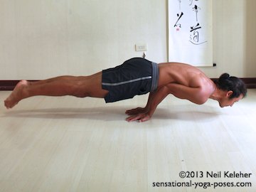 You balance with your belly resting on your elbows in this arm balance yoga pose. However, if you are sweaty it is easy for your elbows to move apart and your belly to slide down between your arms.