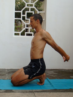 Since the bladder meridian runs down the back of each leg, it can be stretched by doing a forward bend with the legs straight. However, a good preparation to this is doing the equivalent of a forward bend but with the knee bent.