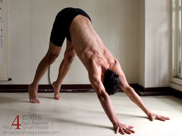 As with downward dog you can do this pose with knees bent of with heels lifted. Options for the arms can include doing it with hands unclasped (and forearms parallel) or with hands clasped.
