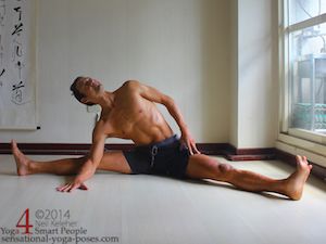 The one I currently use quite a lot is the seated wide leg side bend. Variations of this include bending the other knee so that the shin is folded to the outside of the thigh (hero position) or to the inside of the thigh.